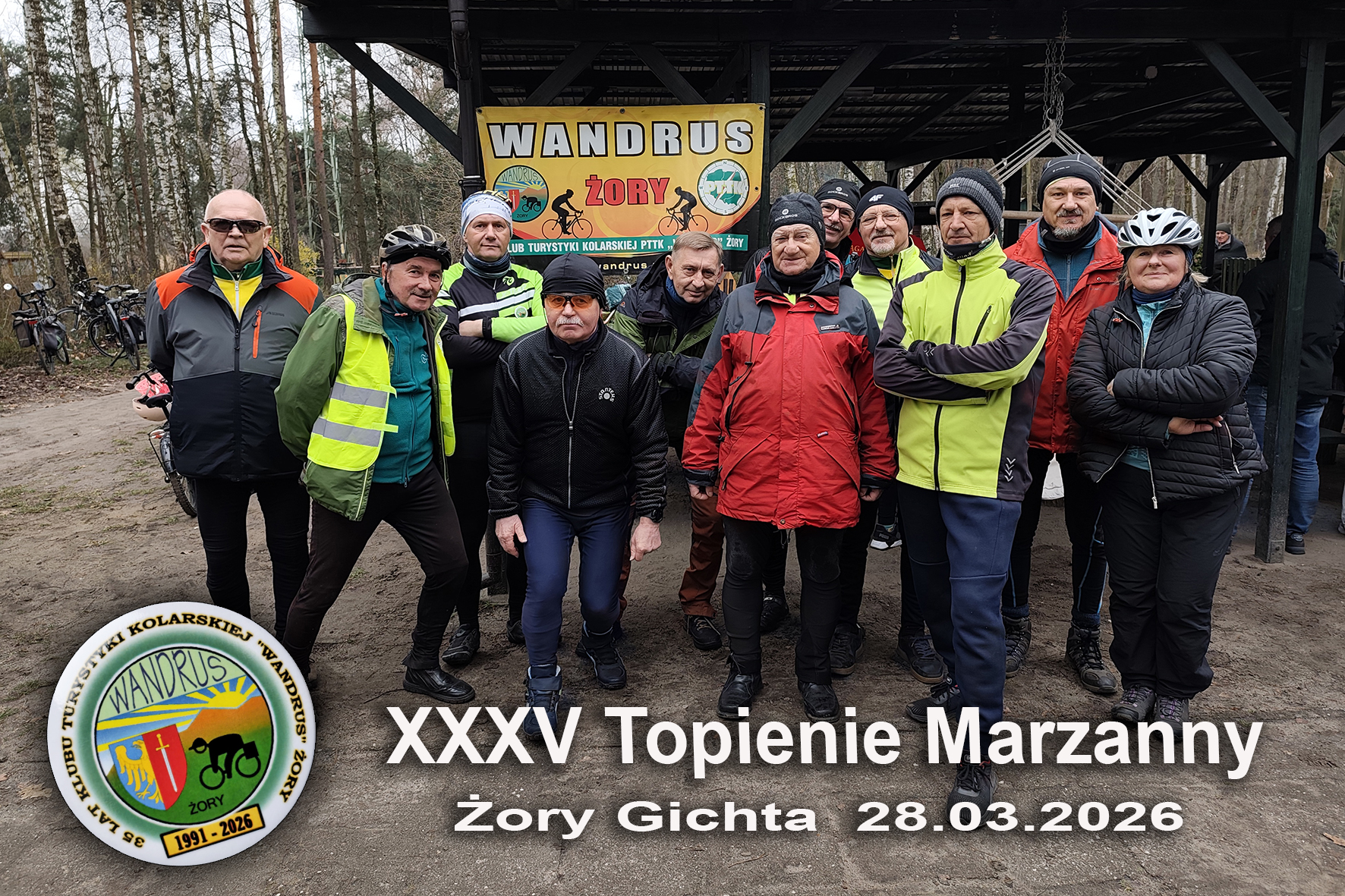 Tydzień od rozpoczęcia sezonu kolarskiego 2026, meldujemy się grupą 12 osób na Jubileuszowym Rajdzie „35 Topienie Marzanny na Gichcie” w Żorach, z metą w Parku Piaskownia. Pogoda tego dnia nie rozpieszczała rowerzystów. Wiszący w powietrzu deszcz oraz chłód nie zachęcał do wyjścia na rower. Jednakże spora grupa rowerzystów z różnych klubów i miejscowości przyjechała, by spotkać się i porozmawiać. Organizator jak co roku zadbał o dobry humor przyjezdnych oferując różnego rodzaju konkursy dla dzieci i dorosłych oraz gorącą kawę, herbatę, kiełbasę i słodki poczęstunek. Głównym wydarzeniem był konkurs na „Najpiękniejszą Marzannę”. Rok 2026 jest też trzydziestym piątym w działalności Klubu Turystyki Kolarskiej PTTK „Wandrus Żory”. Z tej to okazji zaprzyjaźnione kluby rowerowe i organizacje otrzymały od Jubilata „Jubileuszowe Dyplomy Uznania”. Takowy i my otrzymaliśmy.