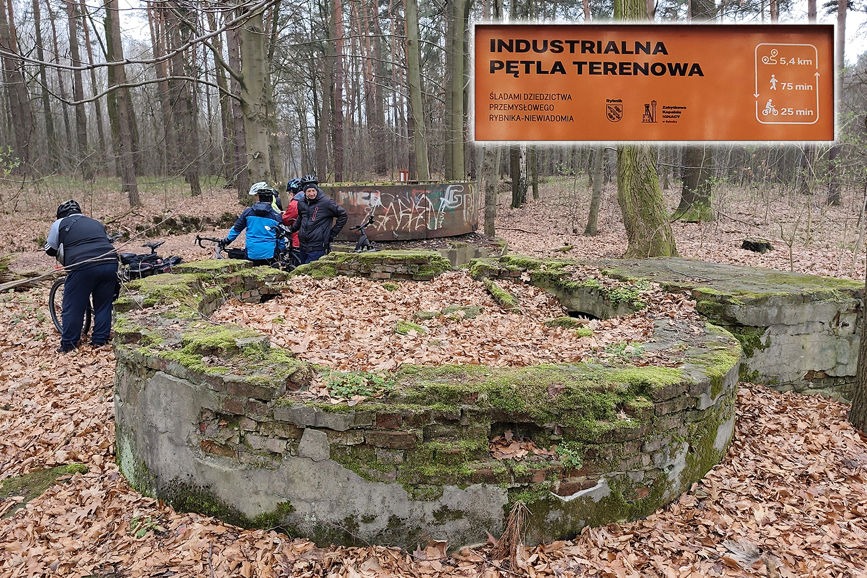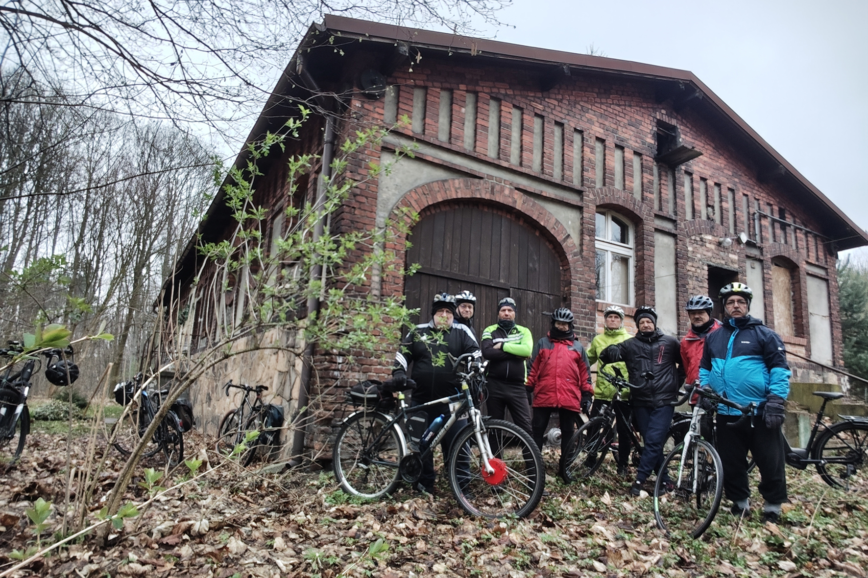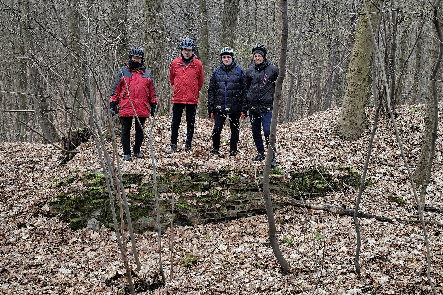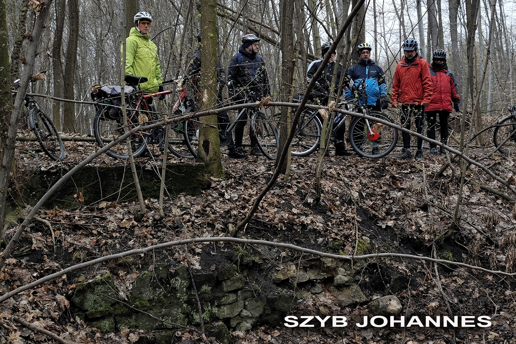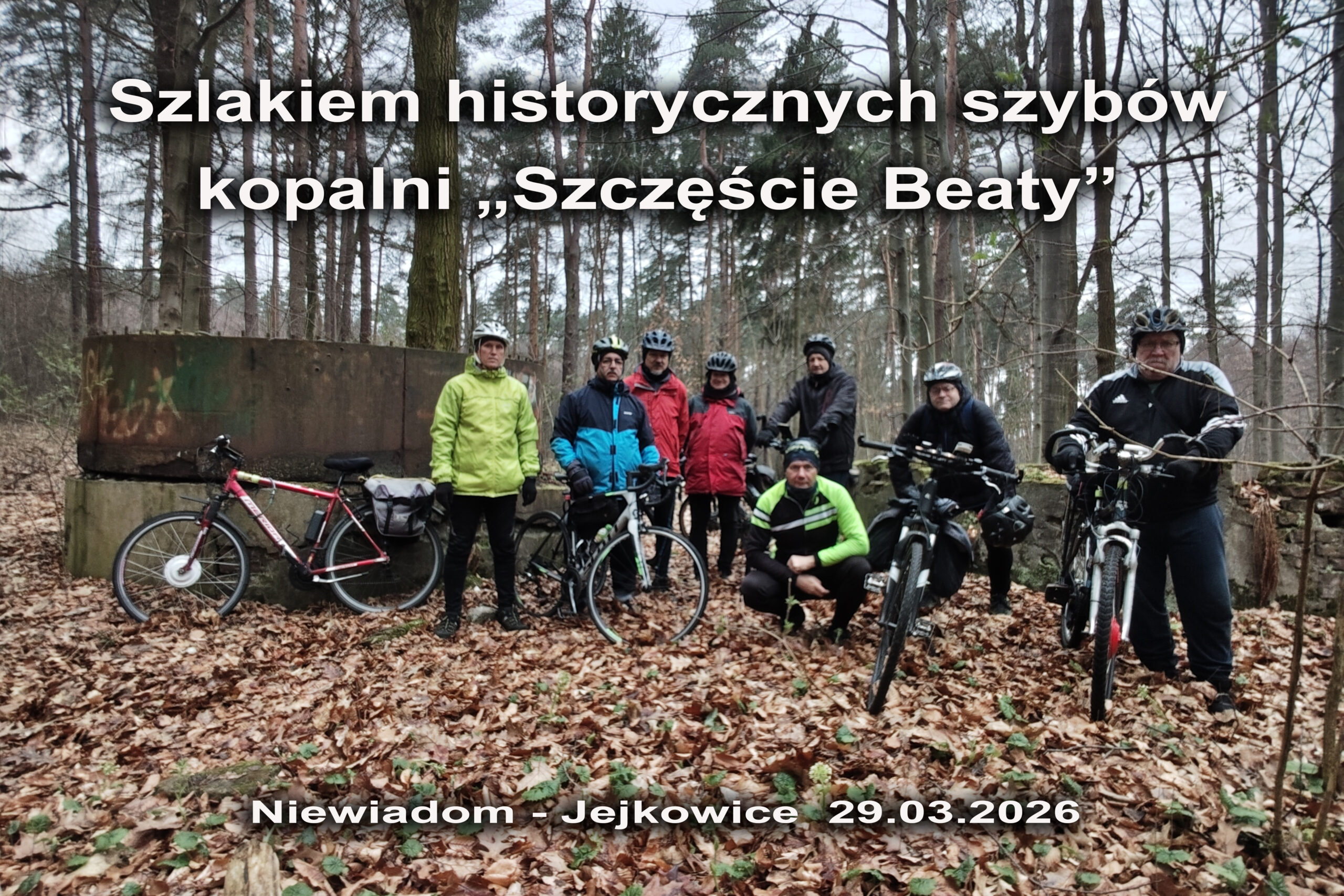 W niedzielne chłodne przedpołudnie wybraliśmy się na wycieczkę rowerową szlakiem historycznych szybów kopalni „Szczęście Beaty”, która funkcjonowała w Niewiadomiu w latach 1856-1919r. Szlak rozpoczynamy w miejscu, który dał początek historii kopalni, przy szybie Fund. Po obiekcie nie ma już śladu. My docieramy do niego jak i pozostałych szybów, korzystają z dostępnych opisów i map. Po krótkim wstępie prowadzącego na temat historii kopalni, ruszamy leśną ścieżką w kierunku kolejnego szybu Johannes (Jan). Został po nim lej i kawałek kamiennego obmurza. Nasypem kolejki piaskowej docieramy w rejon, gdzie istniał szyb wentylacyjny Süd (Południowy). Tu oglądamy doły powstałe po płytkiej eksploatacji pokładów węgla. Następnie kierujemy się w stronę szybu Helena, gdzie natrafiamy na zachowany budynek wozowni ze stajnią, obmurza rampy załadunkowej, fundamenty kuźni, kotłowni i centrali elektrycznej. Kontynuując szlak docieramy do resztek szybów Strahler i Franz (Franciszek), by ostatecznie zakończyć nasz szlak przy szybie Nord (Północny) z zachowanym fragmentem nadszybia (około metrowy okrągły pierścień murowany z cegły) oraz omurowaną metalową konstrukcją, służącą prawdopodobnie jako zbiornik piasku podsadzkowego.